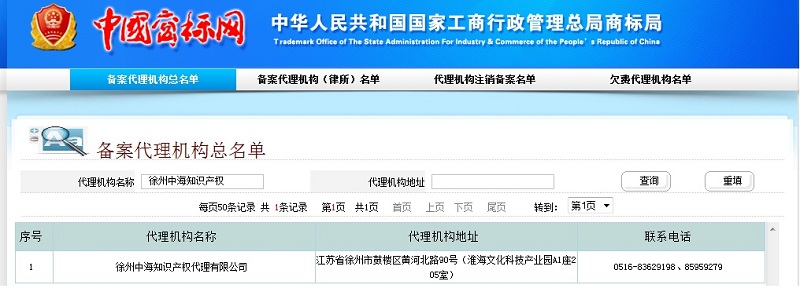 所謂商標(biāo)代理機(jī)構(gòu)即是在國家工商總局商標(biāo)局有合法備案的商標(biāo)代理機(jī)構(gòu),比如在商標(biāo)局系統(tǒng)里面的商標(biāo)代理機(jī)構(gòu)查詢,輸入徐州中海知識產(chǎn)權(quán)代理有限公司,即可出現(xiàn)如下查詢結(jié)果界面。